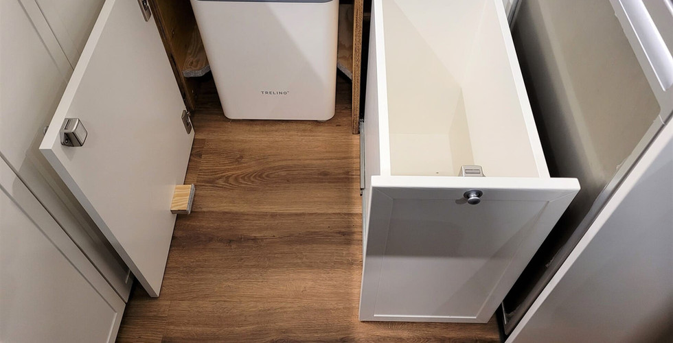 Ein wesentlicher Wunsch der Familie war es genügend Stauraum zur Verfügung zu haben, um sich bezüglich des Reisegepäcks nicht einschränken zu müssen, was hinsichtlich des zulässigen Gesamtgewichts von 5,5 t in diesem Fall eben auch möglich ist. Auf der Fahrerseite im Heckbereich befindet sich ein großzügiger Stauraum mit 2 m Länge unter der Bettkonstruktion. Im Innenraum über dem Bett sind beidseitig Hängeschränke montiert, je ein weiterer befindet sich über dem Küchenmodul und gegenüber von diesem über dem Kühlschrank. Abseits der Schubladen und Unterschränke des Küchenblocks gibt es eine große, tiefe Schublade neben dem Toilettenfach unter dem Bett. Zusätzlich lässt sich die Sitzbank der Sitzgruppe öffnen, wodurch noch mehr Stauraum verfügbar wird. Die Bank/Truhe lässt sich ganz einfach versetzen oder aus dem Fahrzeug entnehmen, da diese mit Handschrauben auf dem Schienensystem befestigt ist. Es ist möglich, Trennwände in die Truhe einzusetzen, um diese in mehrere Fächer zu unterteilen.