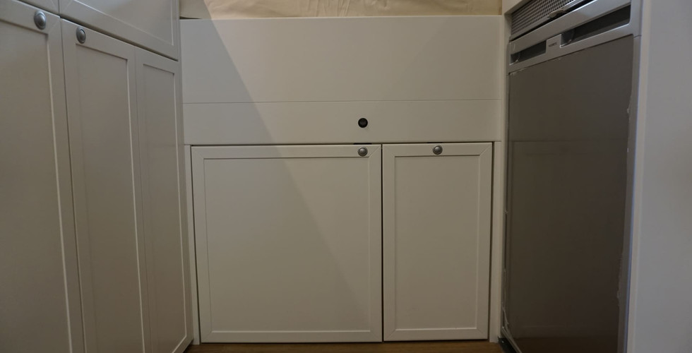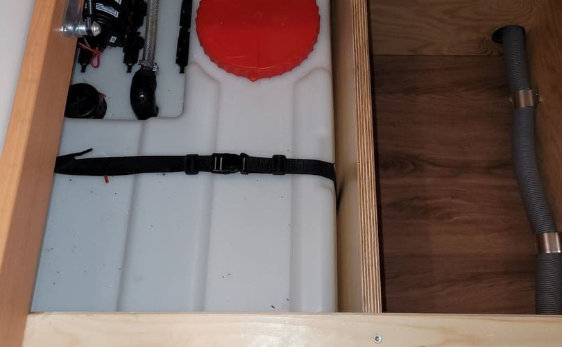 Für die Frischwasserversorgung gibt es einen 80 l Frischwassertank und eine Druckwasserpumpe unter dem Bett im Heck auf der Beifahrerseite. Der Abwassertank hat seinen Platz unter dem Spülbecken im Küchenblock. Die Toilettenlösung war durch die vorhandene Trockentrenntoilette der Familie bereits gegeben. Diese haben wir auf Wunsch in einem Fach unter dem Bett integriert. Hier kann das WC mit 2 Handgriffen in den Innenraum herausgezogen werden. Über dem Fach befindet sich der Schalter für den Lüfter der Toilette.