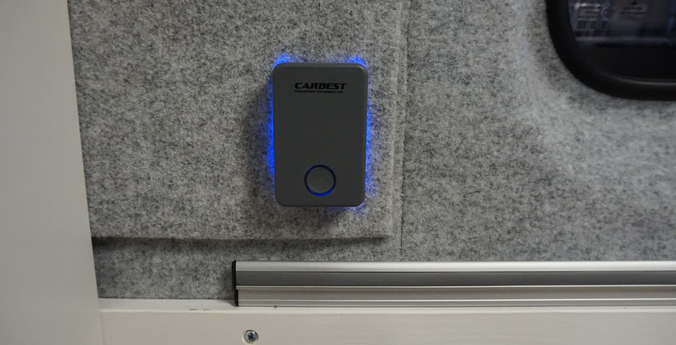 Die elektronische Beleuchtung ist selbstverständlich allein aus funktionalen Gründen – v.a. beim Camping – besonders wichtig. Bei Verwendung etwas dunklerer Hölzer, wie in diesem Fall, ist sie aus unserer Sicht noch wichtiger, damit der Gesamteindruck des Raumes auch ohne Tageslicht nicht zu dunkel ist. Daher haben wir Linienleuchten unter den Hängeschränken im Heckbereich und in der Küche sowie an der Decke über der Küche und Sitzgruppe montiert. Auch das Aufstelldach haben wir mit Linienleuchten ausgestattet, die sich dort "per Touch" bedienen lassen. Ebenso haben wir eine Linienleuchte im Heckbereich unter der Kante des Betts montiert, um den Stauraum ausleuchten zu können. Zusätzlich gibt es jeweils zwei Flex-Leseleuchten im Heckbereich für das Bett und über dem Fenster der Sitzgruppe, die bei Bedarf zusätzlich genutzt werden können. USB-Anschlüsse zum Laden von Smartphones, etc. befinden sich bei den Leselampen des Betts im Heckbereich, in der Wand bei der Sitzgruppe und im Aufstelldach. Diese lassen sich "per Touch" separat ein- und ausschalten.